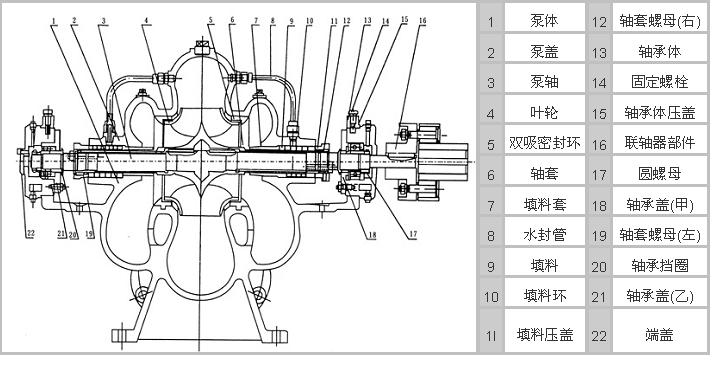 泵主要零件有:泵體、泵蓋、葉輪、軸、雙吸密封環、軸套等。